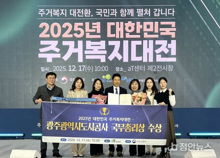 정안뉴스 안정주 기자 | 광주도시공사(사장 김승남)는 17일 서울 양재 aT센터에서 열린 ‘2025 대한민국 주거복지대전’에서 주거복지 향상 및 서민 주거안정에 기여한 공로를 인정받아 국무총리 표창을 수상했다고 밝혔다.