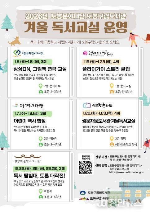 정안뉴스 안정주 기자 | 서울 도봉구 도봉문화재단 소속 구립도서관 5개관이 ‘2026년 겨울 독서교실’을 운영한다.