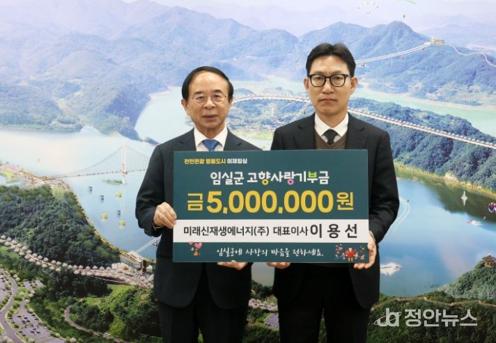 정안뉴스 안정주 기자 | 임실군이 지난 15일 미래신재생에너지(주) 이용선 대표가 지역사회 발전과 주민 복리 증진을 위해 고향사랑기부금 500만원을 기탁했다고 밝혔다.