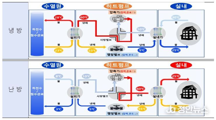 물의 온도는 여름에는 대기 온도보다 낮고, 겨울철에는 높은 특성을 지니고 있다. 수열에너지는 이러한 물의 특성을 이용해 냉‧난방에 활용하는 재생에너지원으로, 냉각탑‧실외기를 생략할 수 있으며, 기존 상수도관을 열원으로 활용해 별도의 송전선로 설치 없이 빠르게 공급할 수 있는 장점이 있는 것으로 알려져 있다.