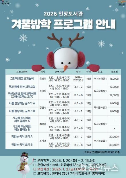 인창도서관은 1월 20일부터 2월 13일까지 초등 문해력 향상을 위한 글쓰기 수업 ‘나를 상상하는 글쓰기’를 비롯해, 책 읽기를 통해 과학 원리를 배우는 ‘책과 함께하는 과학 교실’, 그래비트랙스 교구를 활용한 ‘액션스톤과 함께 과학여행’, ‘체스클래스’, ‘맛있는 독서 요리’ 등 다양한 특강 프로그램을 운영해 따뜻한 겨울방학 학습의 기회를 제공한다.
