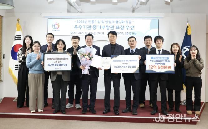 정안뉴스 안정주 기자 | 안양시는 중소벤처기업부가 주관한 ‘2025년 전통시장 및 상점가 활성화 유공’ 포상에서 우수 지자체로 선정돼 중소벤처기업부 장관 표창을 수상했다고 19일 밝혔다.