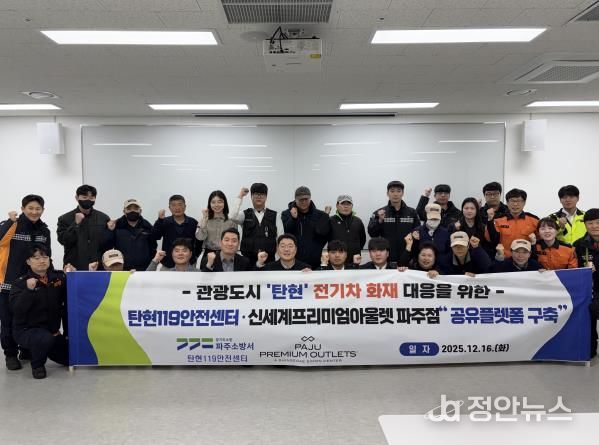 정안뉴스 안정주 기자 | 파주소방서 탄현119안전센터는 16일 신세계사이먼 파주 프리미엄아울렛과 함께 탄현면 관광단지 내 전기차 화재에 신속 대응하기 위한 화재진압 장비 ‘공유플랫폼’을 구축했다.