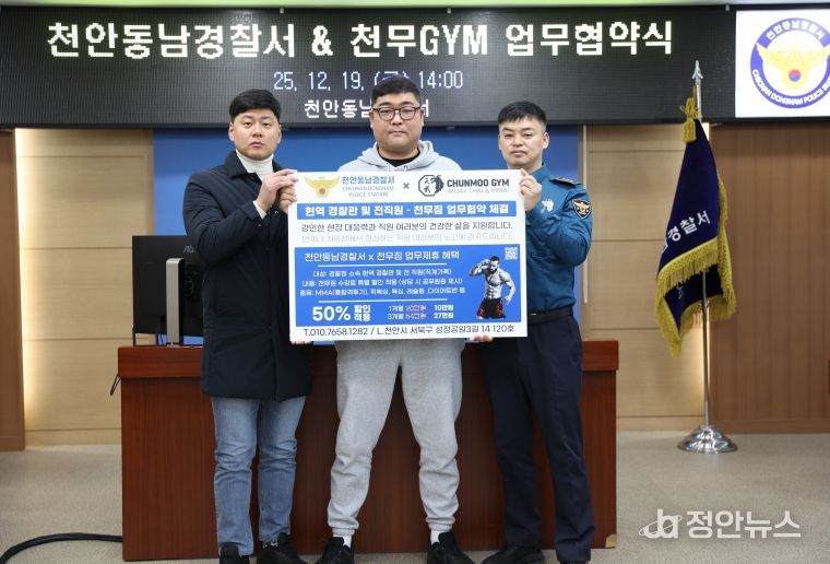 정안뉴스 황도연 기자 | 천안 동남경찰서(서장 송해영)는 2025년 12월 19일(금) 오후 2시, 천안동남경찰서 중회의실에서 무에타이·MMA 전문 체육관인 ‘천무짐’(관장 문보람)과 ‘경찰관 체력 증진 및 복지 향상’을 위한 업무협약(MOU)을 체결했다고 밝혔다.