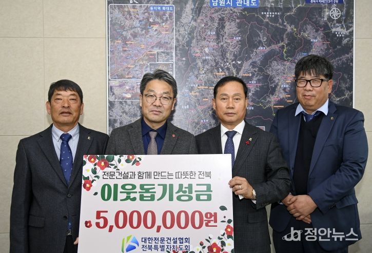 정안뉴스 안정주 기자 | 남원시는 12월 19일 대한전문건설협회 전북도회(회장 임근홍)와 남원지회(회장 김재주)가 '희망2026 나눔 캠페인'에 동참하며 500만 원의 성금을 기탁했다고 밝혔다.