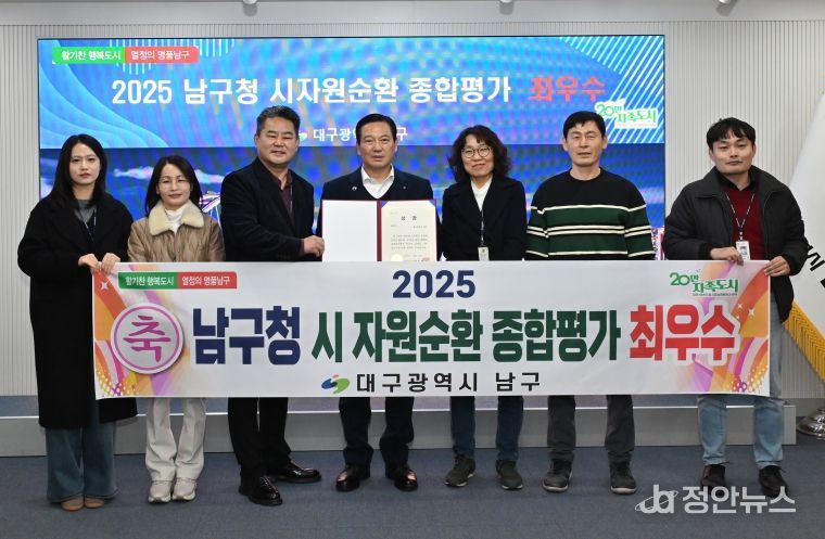 정안뉴스 안정주 기자 | 대구 남구는 2025 대구시 자원순환행정 종합평가에서 9개 구·군 가운데 ‘최우수’(1위)를 차지하며, 자원순환 선도 도시 명품 남구의 위엄을 알렸다.