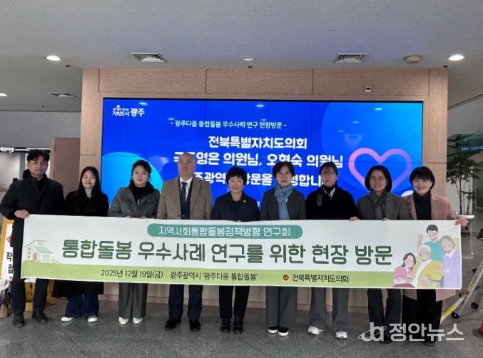 정안뉴스 안정주 기자 | 전북특별자치도의회 ‘지역사회통합돌봄정책방향 연구회’(국주영은 대표의원)가 지난 18일 지역사회 통합돌봄 선도 모델로 평가받는 광주광역시 ‘광주다움 통합돌봄’ 현장을 방문해 사례 연구를 실시했다.