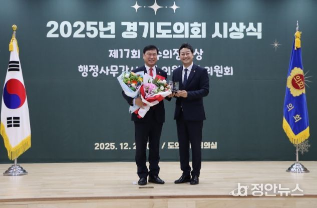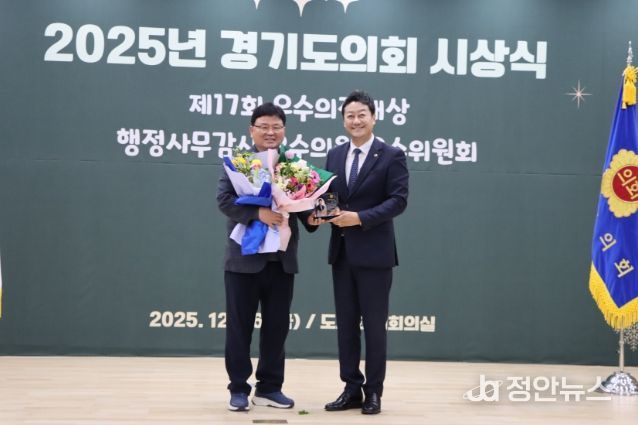 정안뉴스 안정주 기자 | 경기도의회 교육기획위원회 이택수 의원(국민의힘, 고양8)과 성기황 의원(더불어민주당, 군포2)이 26일 열린 2025년 경기도의회 시상식에서 ‘2025년 행정사무감사 우수위원’으로 선정됐다.