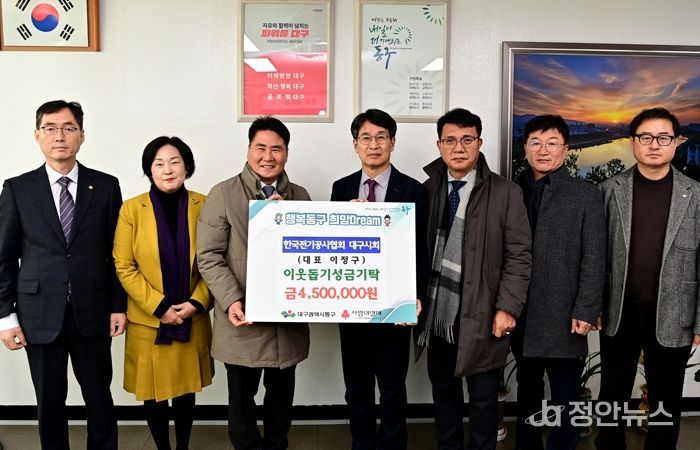정안뉴스 안정주 기자 | 한국전기공사협회 대구시회는 지난 26일, 동구청을 방문해 연말을 맞아 어려운 이웃을 돕기 위한 성금 450만원을 전달했다.