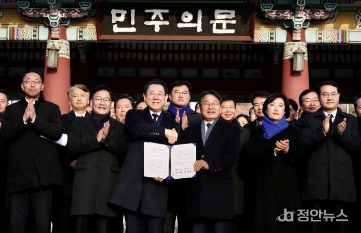정안뉴스 안정주 기자 | 병오년 새해, 광주시와 전남도가 대한민국 민주화의 상징인 국립5·18민주묘지 오월영령 앞에서 광주‧전남 대부흥의 새 역사를 열어가기 위한 행정통합을 즉각 추진하기로 공동 선언했다.