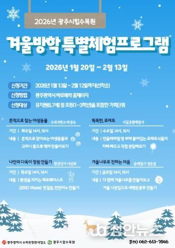 정안뉴스 안정주 기자 | 광주광역시 시립수목원은 어린이를 위한 ‘2026년 겨울방학 체험 프로그램’ 참가자 640명을 오는 13일 오전 10시부터 선착순 모집한다.