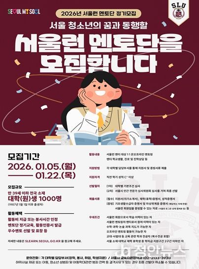 정안뉴스 안정주 기자 | 서울시는 대학생들이 자신의 지식과 경험을 나누며 장학금 혜택과 취업 역량까지 쌓을 수 있는 ‘서울런 멘토단’ 신규 멘토 1,000명을 22일까지 모집한다.