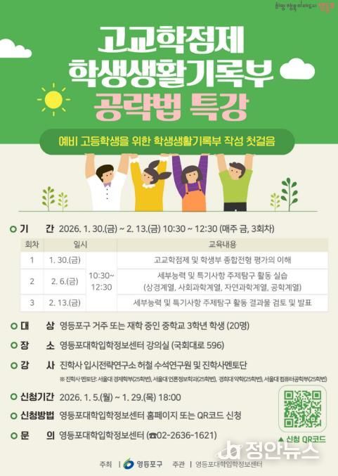 정안뉴스 안정주 기자 | 영등포구가 고교 진학을 앞둔 예비 고등학생을 대상으로 ‘고교학점제·학생생활기록부 공략법’ 특강을 열고, 2029학년도 대학 입시에 대비한 학생부 종합전형 준비 전략을 제시한다고 밝혔다.
