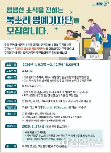 문인 북구청장은 “북소리 명예기자단은 주민이 직접 지역의 변화와 일상을 전하는 메신저인 만큼 이번 모집에 많은 관심과 참여를 바란다”며 “앞으로도 북소리가 주민과 행정의 소통 창구 역할을 할 수 있도록 다양한 지원을 아끼지 않겠다”고 말했다.