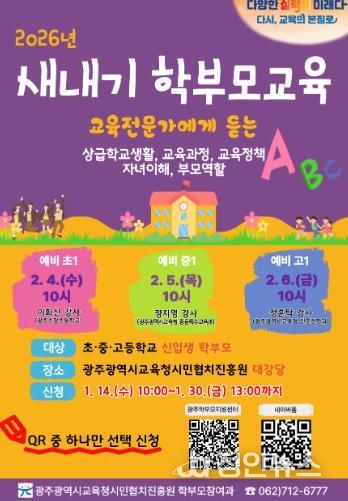 정안뉴스 안정주 기자 | 광주시교육청시민협치진흥원은 오는 2월 4~6일 본원 대강당에서 초·중·고등학교 신입생 학부모를 대상으로 ‘2026년 새내기 학부모교육’을 운영한다.