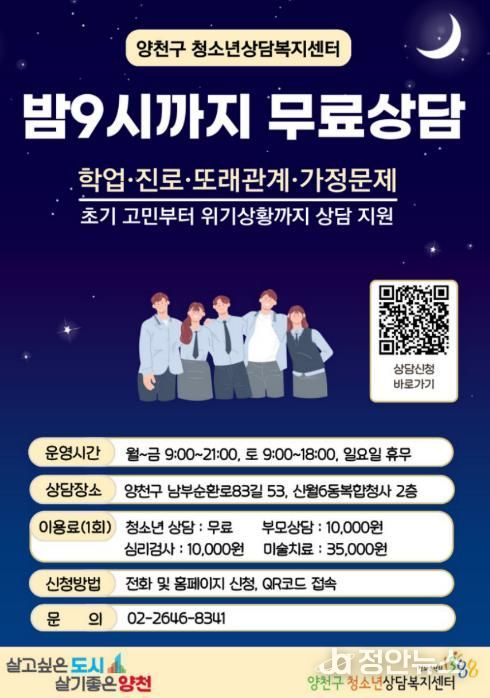 정안뉴스 안정주 기자 | 양천구가 심리적·정서적 어려움을 겪고 있는 청소년의 건강한 성장을 돕기 위해 마음건강 지원 강화에 나섰다. 올해부터 청소년상담복지센터 개인상담 서비스를 전면 무료화하고, 평일 밤 9시까지 연장 운영에 돌입한다.