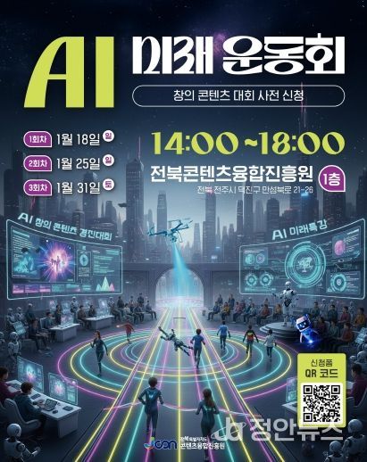 정안뉴스 안정주 기자 | 전북특별자치도가 주최하고 전북특별자치도콘텐츠융합진흥원이 주관하는‘AI 미래운동회 & 창의 콘텐츠 대회’가 오는 1월 18일, 25일, 31일 총 3회에 걸쳐 걸쳐 진흥원 1층에서 개최된다