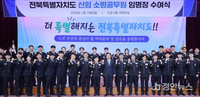정안뉴스 안정주 기자 | 전북특별자치도는 19일 도청 4층 대회의실에서 2026년 신임 소방공무원 임명장 수여식을 열고, 도민의 생명과 안전을 지킬 신임 소방공무원 45명을 공식 임명했다.