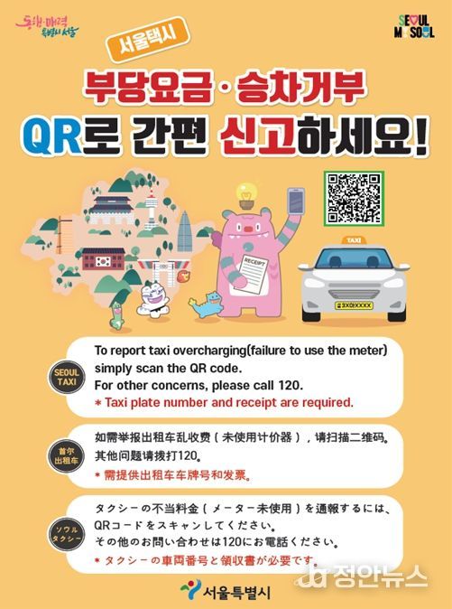 서울시는 외국인이 택시 이용 중 부당요금이나 불편을 겪었을 경우 현장에서 바로 신고할 수 있도록 택시 내부 및 주요 관광지 등에 ‘QR 택시 불편신고 시스템’ 안내 스티커·현수막·포스터를 부착하고, 서울시 공식 SNS를 통해서도 지속적으로 홍보하고 있다.