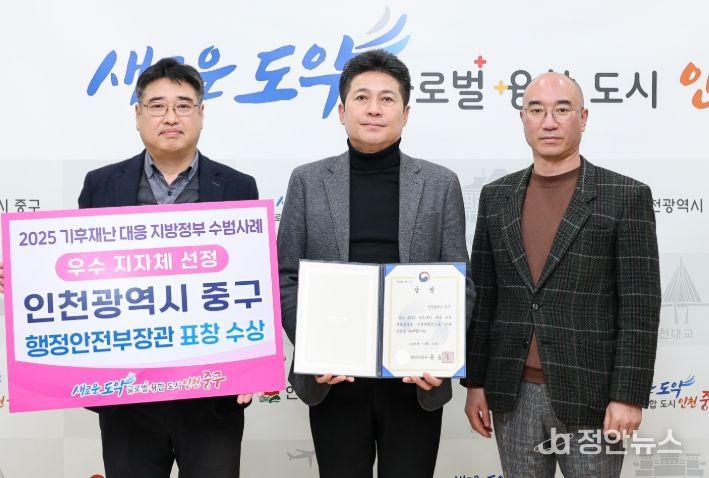정안뉴스 안정주 기자 | 인천시 중구는 행정안전부가 주관한 ‘2025년 기후 재난 대응 우수 지자체’에 선정돼 행안부 장관 표창의 영예를 안게 됐다고 21일 밝혔다.