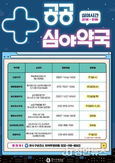 연수구 관계자는 “공공심야약국은 야간 시간대 구민 건강을 지키는 지역 의료안전망”이라며 “앞으로도 주민들이 필요할 때 언제든지 도움받을 수 있도록 안정적인 운영에 힘쓰겠다.”라고 밝혔다.