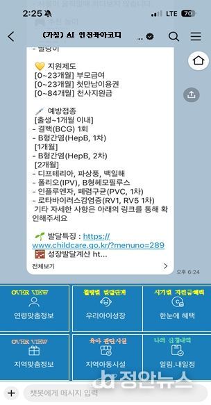 정안뉴스 안정주 기자 | 인천광역시는 가정에서 영유아를 양육하는 부모들이 육아 정보를 보다 쉽고 편리하게 이용할 수 있도록 (가칭)‘인공지능(AI) 인천육아코디’ 챗봇 서비스를 추진한다고 밝혔다.