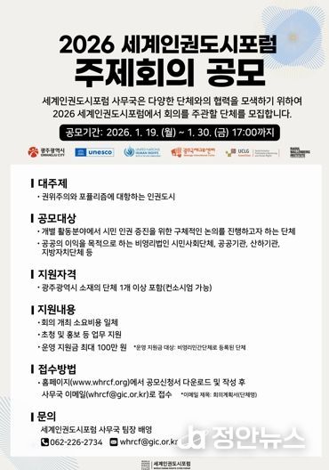 정안뉴스 안정주 기자 | 광주광역시는 ‘2026 세계인권도시포럼’에서 주제회의를 주관할 시민사회단체를 오는 30일까지 공개 모집한다.