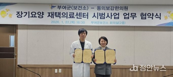 정안뉴스 황도연 기자 | 부여군은 거동이 불편한 장기 요양 수급자가 재택에서 의료서비스를 받을 수 있도록 지원하는‘장기 요양 재택 의료센터 시범사업’추진을 위해 지역 의료기관인 동의보감한의원과 업무협약을 체결했다고 26일 밝혔다.
