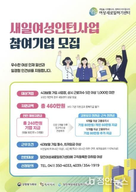 정안뉴스 황도연 기자 | 당진시는 당진여성새로일하기센터에서 ‘새일여성인턴사업’에 참여할 기업과 참여자를 연중 상시 모집한다고 27일 밝혔다.