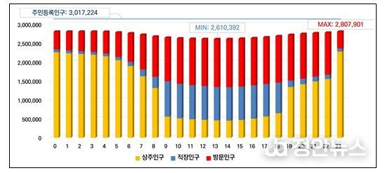 직장인구는 평일 오전 9시에 93만~110만 명으로 가장 많고, 방문인구는 토요일 14~17시에 134만~142만 명으로 최고치를 기록하는 등 출근 시간대․주말 쇼핑․여가 시간대에 인구가 집중되는 패턴이 뚜렷하게 나타났다.