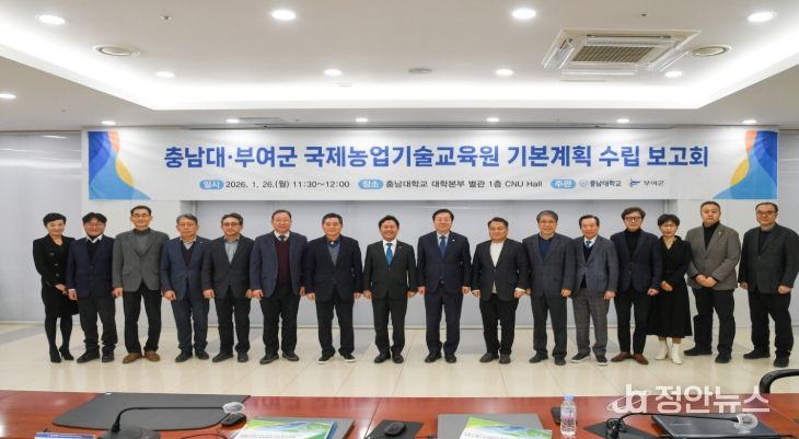 정안뉴스 황도연 기자 | 부여군은 지난 26일 충남대학교에서 박정현 부여군수와 김정겸 충남대 총장 등 관계자 28명이 참석한 가운데 ‘국제농업기술교육원 설립 기본계획 수립 최종 보고회’를 개최했다.