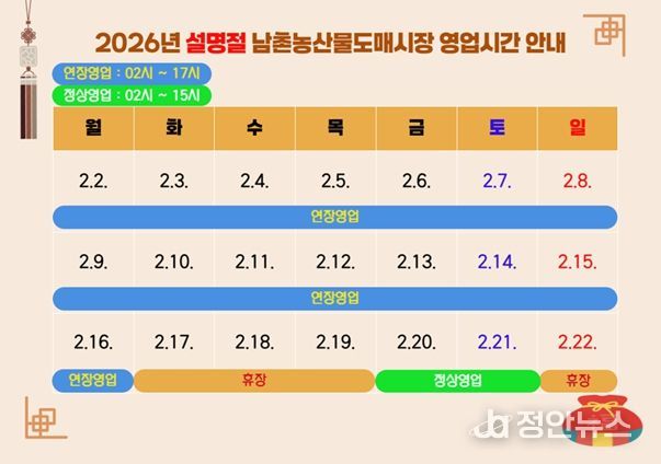 김정희 시 남촌농축산물도매시장관리사무소장은 “설 명절 동안 시민들이 안심하고 도매시장을 이용할 수 있도록 성수품 수급 관리와 안전, 교통, 환경 관리 전반에 최선을 다하겠다” 라고 말했다.