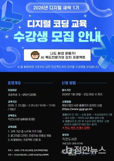 정안뉴스 안정주 기자 | 인천 계양구 작전도서관(관장 한양진)은 겨울방학을 맞아 디지털 코딩 교육 프로그램 '디지털 새싹 1기'를 운영한다고 밝혔다.