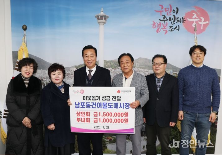 정안뉴스 황정혜 기자 | 부산 중구는 남포동건어물도매시장 상인회(회장 최기찬)와 부녀회(회장 박영희)에서 지난 28일 방문해 이웃돕기성금으로 250만 원(상인회 150만 원, 부녀회 100만 원)을 기탁했다고 밝혔다.