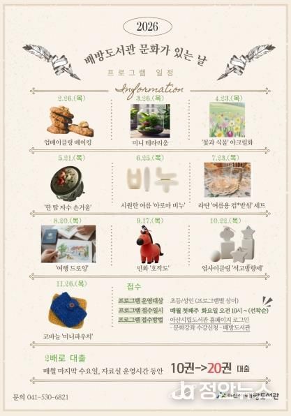 정안뉴스 황도연 기자 | 배방도서관은 2월부터 11월까지 매달 하루를 지정해 ‘도서관 문화가 있는 날’ 프로그램을 운영할 계획이다.