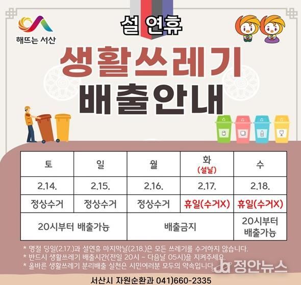 시는 설연휴 생활 쓰레기 수거 일정을 2월 13일까지 서산시 누리집, 중앙호수공원 전광판, 서산시 사회관계망서비스 등을 통해 시민에게 홍보할 계획이다.