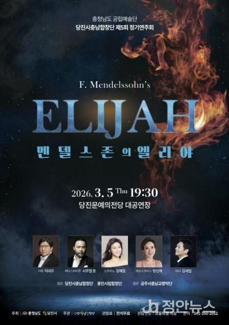 정안뉴스 황도연 기자 | 당진시충남합창단이 오는 2026년 3월 5일 19시 30분, 당진문예의전당 대공연장에서 제5회 정기연주회 ‘멘델스존의 엘리야’무대를 선보인다.