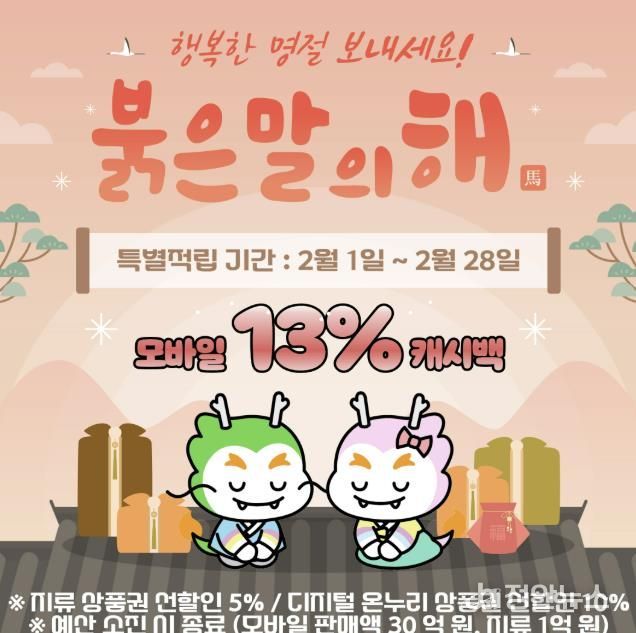 정안뉴스 황도연 기자 | 충남 계룡시는 설 명절을 앞두고 2월 한 달간 계룡사랑상품권 사용 시 결제금액의 13%를 캐시백으로 적립해 주는 특별적립 행사를 시행한다고 밝혔다.