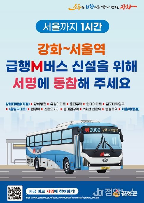 정안뉴스 안정주 기자 | 강화군은 ‘강화~서울역 M버스(광역급행버스)’ 노선 신설 유치를 위해 대규모 범군민 서명운동을 전개하며, 대대적인 행정력 집중에 나선다.