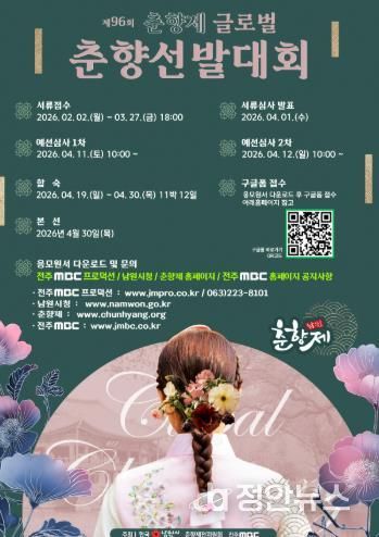 [20260202112252-88250]정안뉴스 안정주 기자 | 남원시는 제96회 춘향제를 맞아 ‘글로벌 춘향선발대회’ 참가자를 2월 2일부터 3월 27일까지 모집한다.
