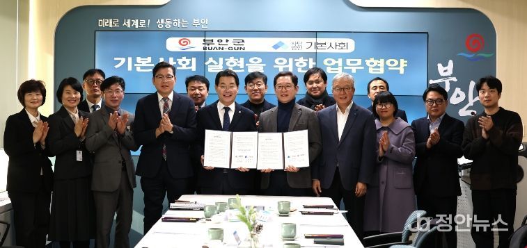 정안뉴스 안정주 기자 | 부안군은 2일 군청 중회의실에서 사단법인 기본사회와 ‘기본사회 실현을 위한 업무협약(MOU)’을 체결하고, 지역 실정에 맞는 기본사회 정책 발굴과 실행을 위한 전략적 협력체계를 구축했다.
