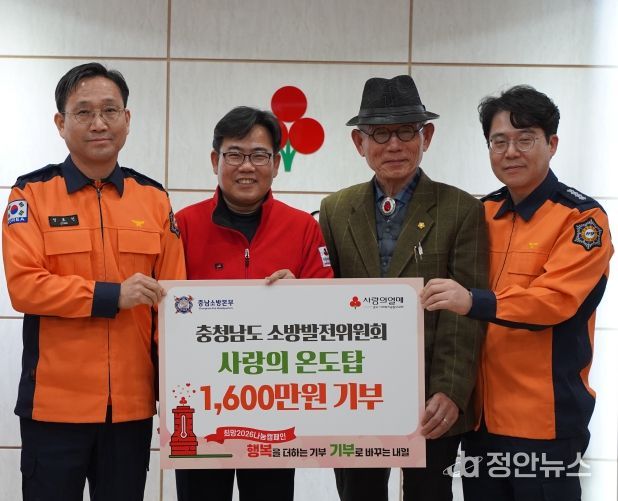 정안뉴스 황도연 기자 | 충청남도 소방발전위원회(소방정책 자문·협의기구)는 지난 30일 연말연시 이웃돕기 성금 모금인 ‘사랑의 온도탑’에 성금 1600만 원을 기탁했다고 1일 밝혔다.