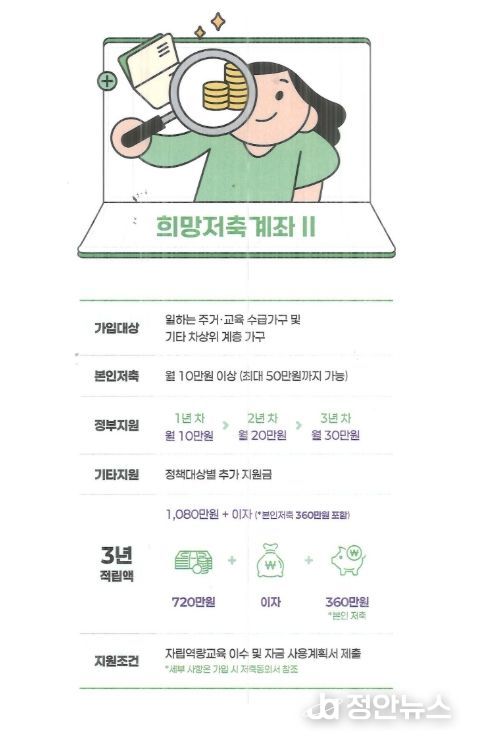 ‘희망저축계좌2’는 근로·사업 소득이 있는 주거·교육 급여 수급 가구 또는 차상위계층이 저축하는 경우, 정부가 일정 금액의 근로소득 장려금을 지원해주는 사업이다.