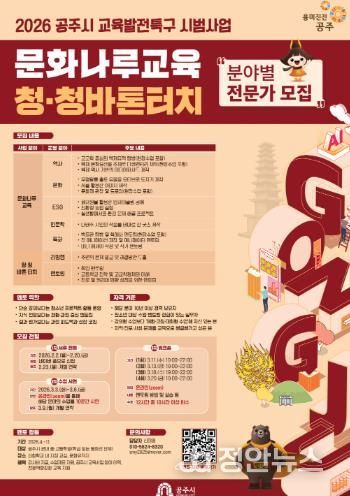 정안뉴스 황도연 기자 | 공주시는 공주시 교육발전특구 시범사업을 본격 추진하기 위해 청소년에게 현장 중심 멘토링을 제공할 ‘문화나루교육’과 ‘청-청 바톤 터치’ 분야별 전문가를 모집한다.