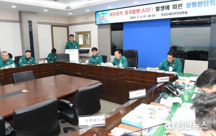 정안뉴스 김재홍 기자 | 창녕군은 4일 대합면 소재 양돈농가에서 아프리카돼지열병(ASF)이 확인됨에 따라, 2월 4일 오전 군수 주재로 상황판단회의를 개최하고 초기 대응 상황 점검 및 추가 확산 차단을 위한 대응 방안을 집중 논의했다.