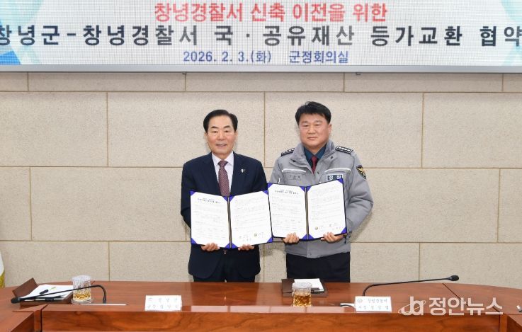 정안뉴스 김재홍 기자 | 창녕군은 3일 군청 군정회의실에서 창녕경찰서와 ‘창녕경찰서 신축 이전을 위한 국·공유재산 등가교환 협약’을 체결했다.