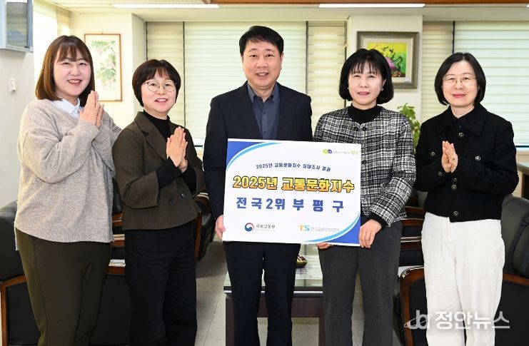 부평구는 최근 국토교통부 주관, 한국교통안전공단이 실시한 ‘2025년 교통문화지수’ 평가 결과, 동일그룹(전국 69개 자치구)에서 2위를 달성했다고 밝혔다.