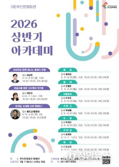 정안뉴스 황정혜 기자 | (재)부산문화회관은 오는 3월 9일부터 7월 1일까지 2026년도 상반기 정규 아카데미 강좌를 개설한다.