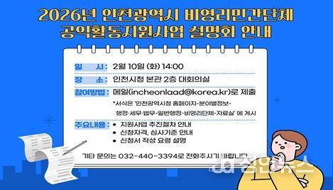 정안뉴스 안정주 기자 | 인천광역시는 비영리민간단체의 공익활동을 활성화하고 원활한 사업 참여를 지원하기 위해 '2026년 인천광역시 비영리민간단체 공익활동 지원사업 설명회'를 오는 2월 10일 개최한다고 밝혔다.