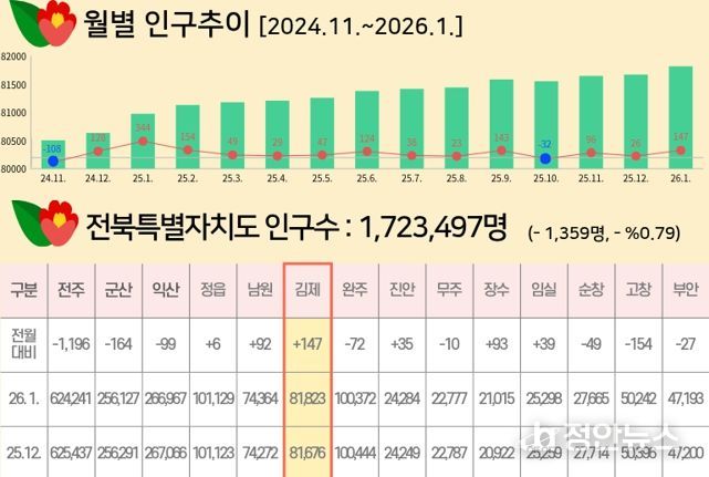행정안전부 주민등록 인구통계에 따르면 2026년 1월 말 기준 김제시의 주민등록인구는 81,823명으로 전월 대비 147명이 증가했다.